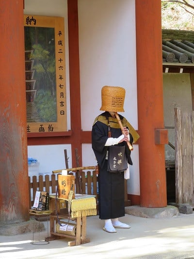 紅葉時期の虚無僧による尺八の音色が寺の美しさをさらに増す