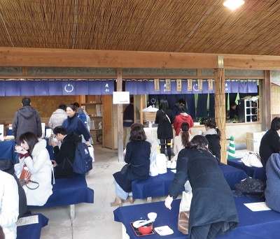 「野点大茶湯(のだておおちゃのゆ)」も行われ、近隣の茶屋街・上七軒の芸妓・舞妓からお茶をふるまってもらえるためとても人気があります。しかし定員3,000名が、10:00~15:00の間に約30人ずつ一斉にいただくので時間は平均5分もありません。当日のチケット入手もほぼ困難なようです。1月25日から神社内で1枚1,500円で販売されますが、早々に売り切れます。