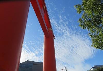 京近美の前の大鳥居が青空に映える