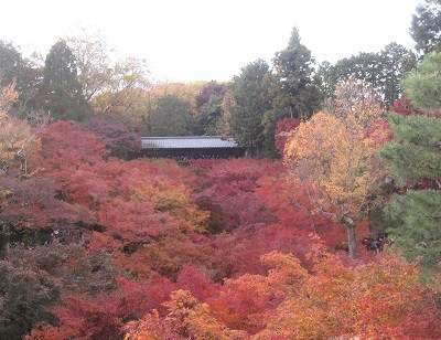 京都に紅葉の名所は幾多もありますが、その質と量で東福寺をNo.1にあげる人が最も多いでしょう。東福寺の境内は東山からの清流が形成する渓谷を巧みに取り入れています。その渓谷・洗玉澗(せんぎょくかん)を紅葉が埋め尽くす光景はまさに圧巻です。