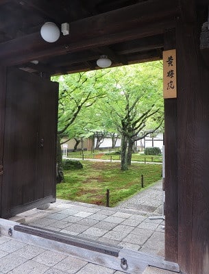 京都の禅寺の多くは、本堂に向かう際に通る唐門に向かって庭を通り抜ける路地を設けます。黄梅院の唐門に至る路地は、周囲の庭に背の高い木が少なく、地面の苔を目立たせるようにデザインされています。そのため苔のキャンバスの上に唐門が置かれているように見え、ことさら落ち着いて上質に見えます。この唐門は黄梅院の見事な個性の一つです。