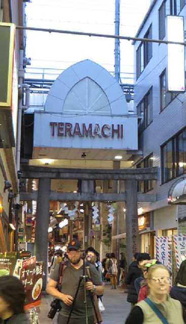 この神社にはまだ話のネタがある。錦名物の「変な鳥居」で、鳥居がビルに突き刺さっているのだ。錦市場から錦天満宮に続くアーケードを出たところにその鳥居はある。何らかの区画割の際のミスの結果だろう。敷地一杯に建てたいビルのオーナーが、さすがに鳥居を削るわけにいかないので、鳥居の端を建物に含める形で建てたと思われる。言われなければ気づかないが、ほのぼのした光景だ。