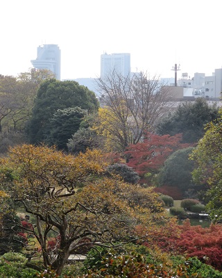 北側の高台からは日本庭園と東京の遠景を見下ろすことができます。紅葉の時期でしたので実に見事な風景でした。小石川植物園は近くの椿山荘とともに、高低差を回遊しながら楽しめることが大きな魅力です。京都の庭園にはほとんどない魅力です。