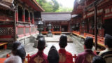室町時代になると、京都でも流行するようになった猿楽を、足利義満が今熊野神社で鑑賞します。以降室町幕府で厚く保護されるようになり、観阿弥・世阿弥によって大成された能が上流階級の芸能として確立します。狂言を含めた猿楽も寺社の余興行事として定着するようになり、今に至ります。