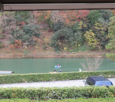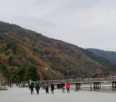 ミュージアムは大堰川の北岸の小倉山の麓にあります。館の裏にはこちらも大堰川の眺めが抜群の亀山公園があります。渡月橋から歩く大堰川沿いの道からは、何といっても嵐山の絶景が四季を通じて楽しめます。普通に歩けば5分ほどですが、記念写真を撮らない人はまずいないので、10分以上かけてゆっくり歩くことをおすすめします。