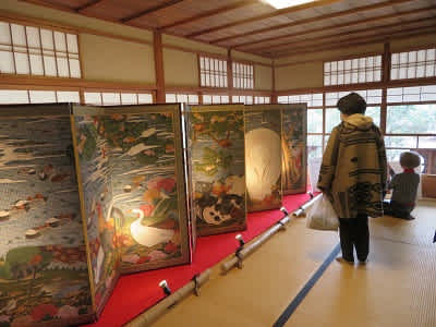 京都・旧三井家下鴨別邸で、伊藤若冲作品の中でも知名度がトップクラスの静岡県立美術館所蔵「樹花鳥獣図屏風」の驚きの高精細複製品が展示されています。