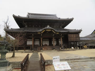 国宝の御影堂は1666(寛文6)年、如来堂は1744(延享元)年の建立です。いずれも南面して並んでおり、通常は東面する真宗寺院の中では異色です。本尊を安置するのは阿弥陀堂ではなく如来堂と言います。御影堂は浄土宗のように「みえいどう」と読み、「ごえいどう」と読む他の真宗寺院とは異なります。