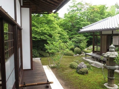 円窓と角窓を室内から見るだけでなく、外側の庭も鑑賞しましょう。北山を借景とした豊かな緑はかけがえのない輝きを見せています。禅寺は自己と向き合うために美しい庭を作ります。しっかりと庭とも向き合うと、さらに心が軽くなります。