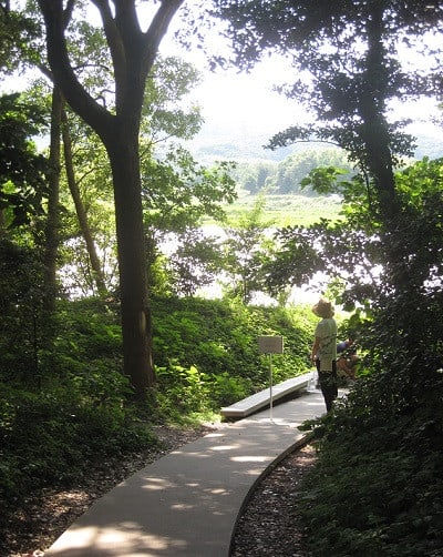 丘の頂上らしきところまでたどり着くと、真っ白な不思議な物体が見える。何となく「ここか?」と感じたが、「美術館」という表示が見当たらない。しかし明らかに歩道とわかる細道が作られており、無言で誘っているように感じたので進んでみた。薄暗い道は丘にたどり着くまでのおおらかな道から一変して神秘的、この道で大丈夫か?とハラハラ・ドキドキしながら歩くとすぐに入口が見えてきた。