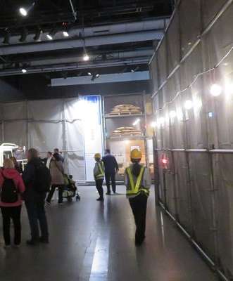 案内スタッフは黄色のヘルメット、展示室の壁は足場