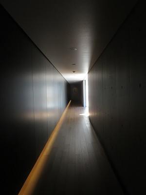 玄関から展示空間へ向かう廻廊は、外部光を遮るように造られており、特別な空間へ進んで行くことを予感させます。廻廊の中央だけがガラス張りで、クスノキがすらりと伸びたシンプルな庭園を目にします。
