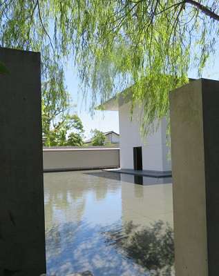 展示空間を出ると、水が張られた「水鏡の庭」を見ながら思索空間に向かいます。展示空間へ向かう暗い廻廊とは真逆に、全面ガラス張りの回廊からは水面で表現された静寂な世界が見えます。禅寺にあるシンプルな白砂しかない庭園を思わせます。