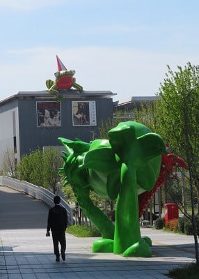 「鳥獣戯画 猫又と狸 下絵」を看板オブジェに採用