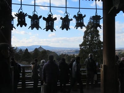 二月堂は懸造(かけづくり)の正面にある舞台には、24時間いつでも自由にのぼることができますが、元旦に日付が変わった深夜が幻想的です。日付が変わってから撞き始められる除夜の鐘の音色と共に、大仏殿から二月堂に至る参道の灯篭に火が灯されていきます。舞台からは奈良の夜景が見えます。