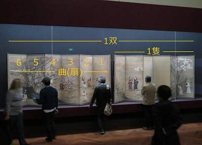複数枚連結した1組の屏風を数える単位を「隻(せき)」といい、6枚連結の屏風が2隻で一対のペアをなしているのが六曲一双です。6枚連結の屏風が1隻だけの作品は「六曲一隻」と呼びます。1隻に連結する曲(扇)の数は6が多いですが、2/4/8もあります。奇数は聞いたことがありません。なお曲ではなく「扇(せん)」と数える場合もあります。